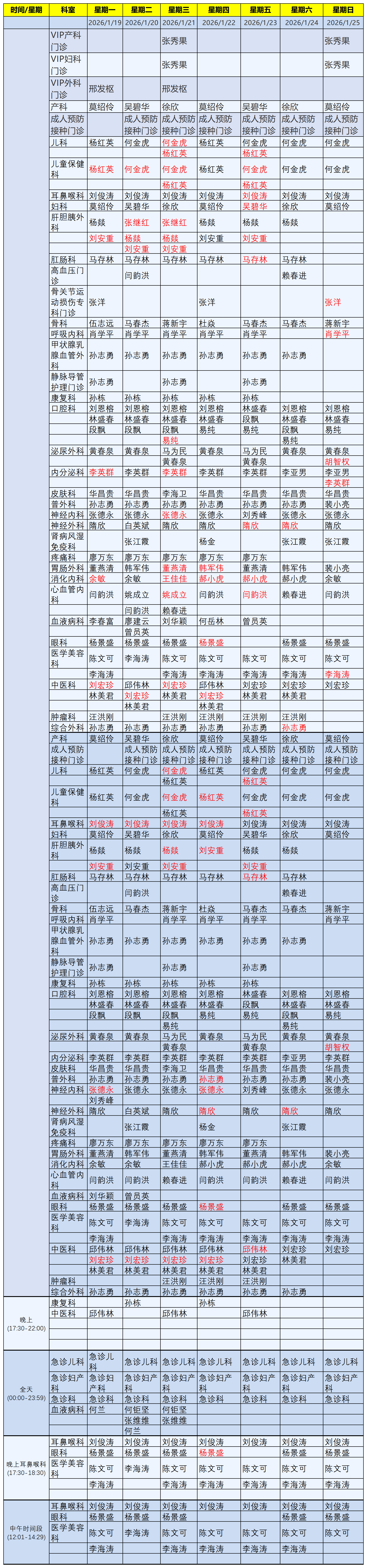 门诊专家排班表